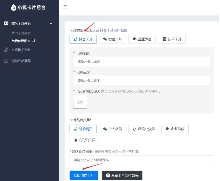 2. 创建卡片:在第三方工具后台选“抖音卡片”,填标题等信息,暂不开启跳转。可提前规划卡片内容,便于后续灵活调整。