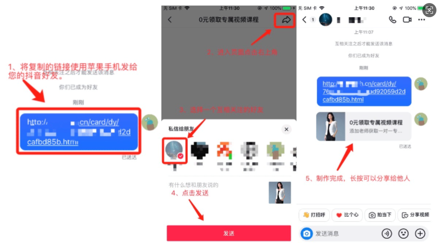 3. 复制发送:从“我的卡片详情”复制链接,苹果手机发抖音好友分享。利于测试卡片效果,扩大范围。