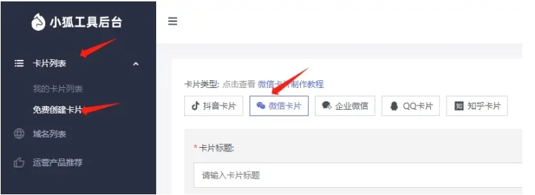 2.创建卡片:在后台点创建,选微信卡片,填信息创建,先不开启跳转,可专注完善卡片内容。