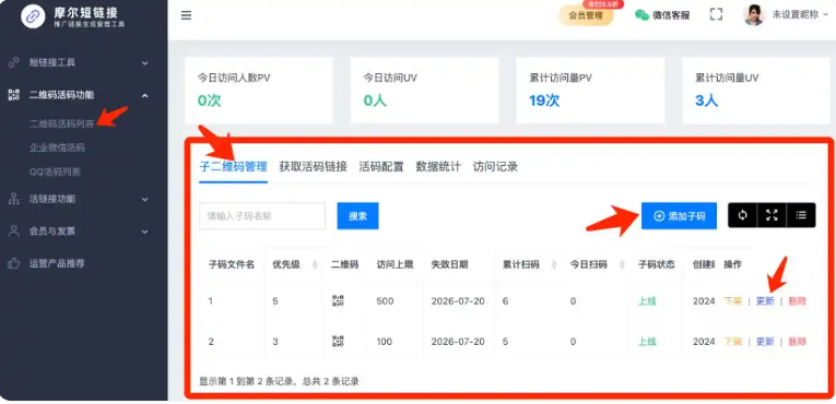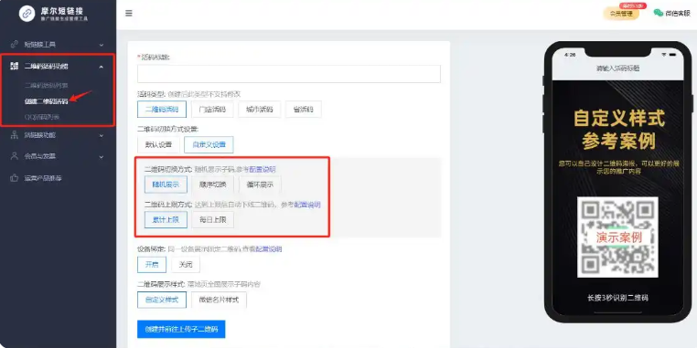 2. 进入官网后台,填活码分类、类型、切换方式等参数,确保准确,不懂看演示,之后点“创建并上传子二维码”。