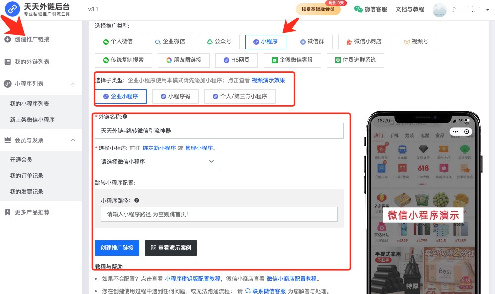 步骤二:进入外链配置系统,选择推广类型——微信小程序、填写相关信息,创建链接。