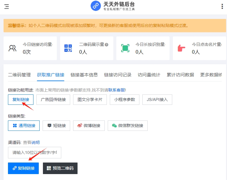 步骤二:进入外链配置系统,选择推广类型——个人微信、填写相关信息,创建链接。
