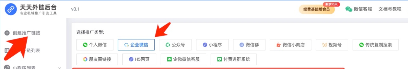步骤二:进入外链配置系统,选择推广类型——企业微信、填写相关信息,创建链接。
