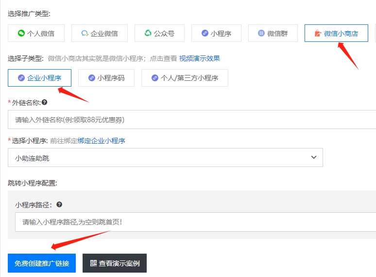 步骤二:进入外链配置系统,选择推广类型——微信小商店(h5网页)、填写相关信息,创建链接。