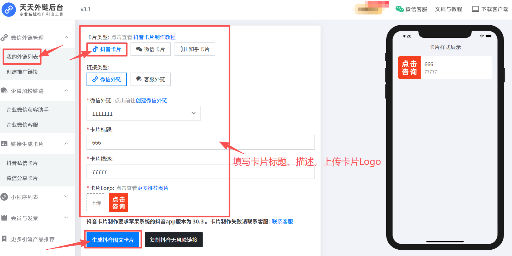 选择“图文卡片类型”中的“抖音卡片”并前往制作,根据提示依次填入卡片标题、描述、logo图片等内容,还可添加渠道码追踪不同卡片点击效果,卡片样式支持完全自定义。