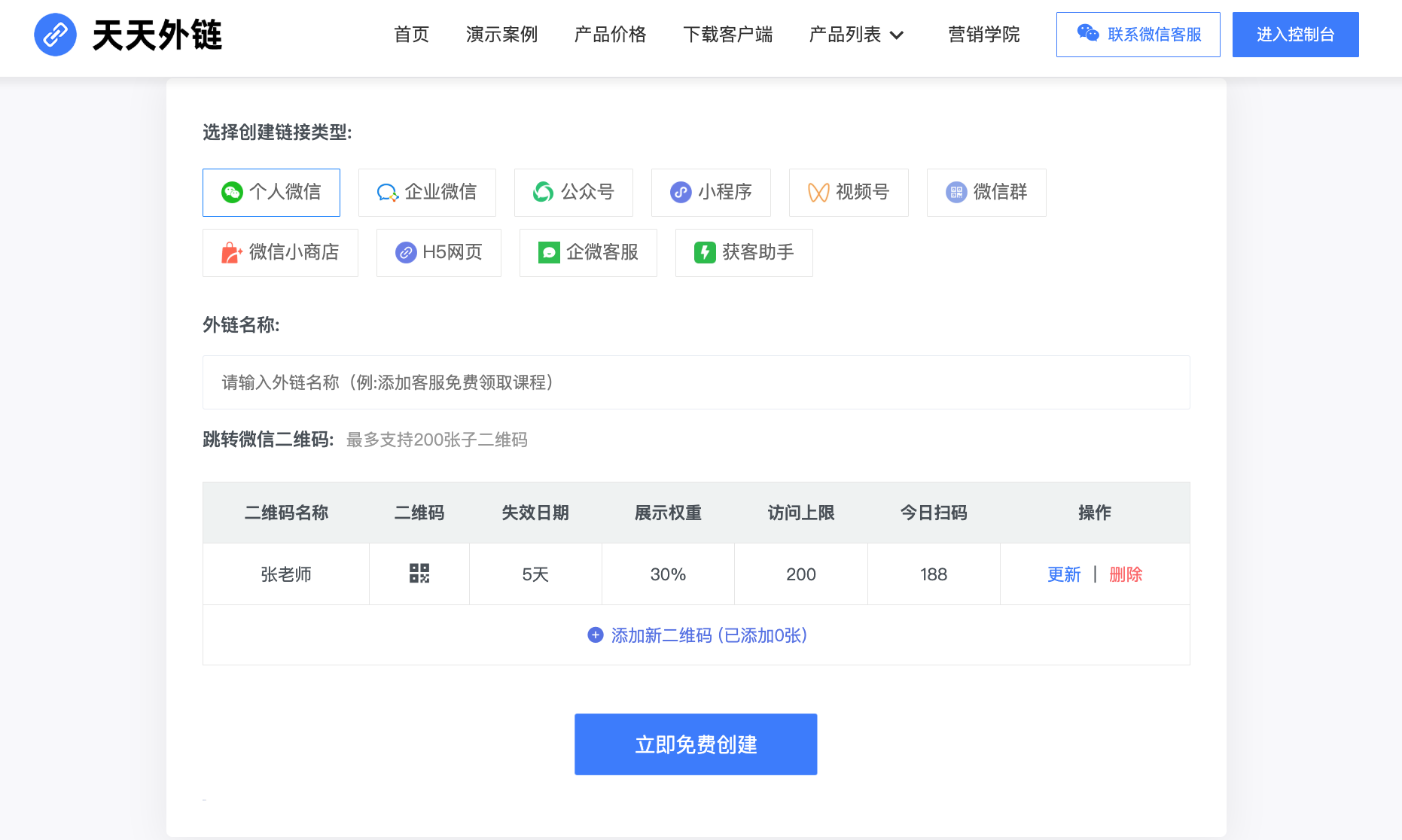 第二步:创建推广链接。在后台左侧工具栏找到并点击“创建推广链接”功能。然后根据您的推广目标,选择需要跳转的微信场景类型,例如“个人微信”、“企业微信”、“微信群”或“小程序”等。