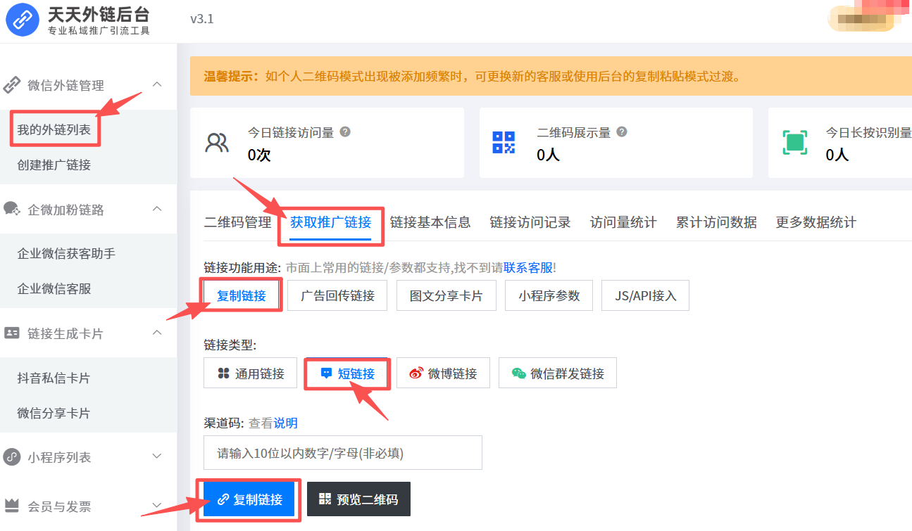 普通短信链接无法直接唤醒微信,用户需手动复制、打开浏览器、再跳转,流失率极高。天天外链正是为解决这一痛点而生。它提供三大核心功能:一键跳转微信,支持公众号、个人号、群聊;二维码活码,可设置子码切换、有效期和访问上限;数据回传上报,精准统计点击转化,优化推广成本。无需技术背景,就能让短信营销真正“直达”微信。